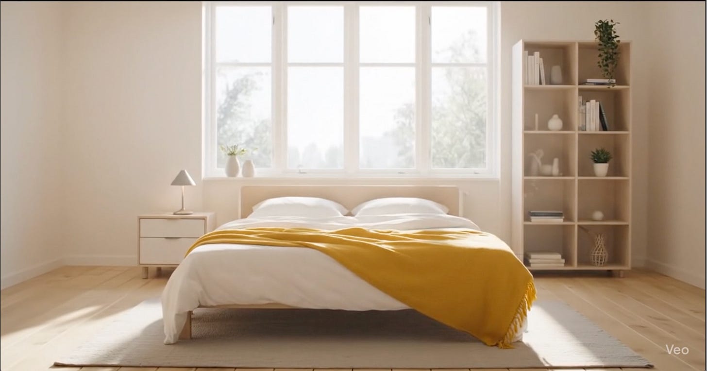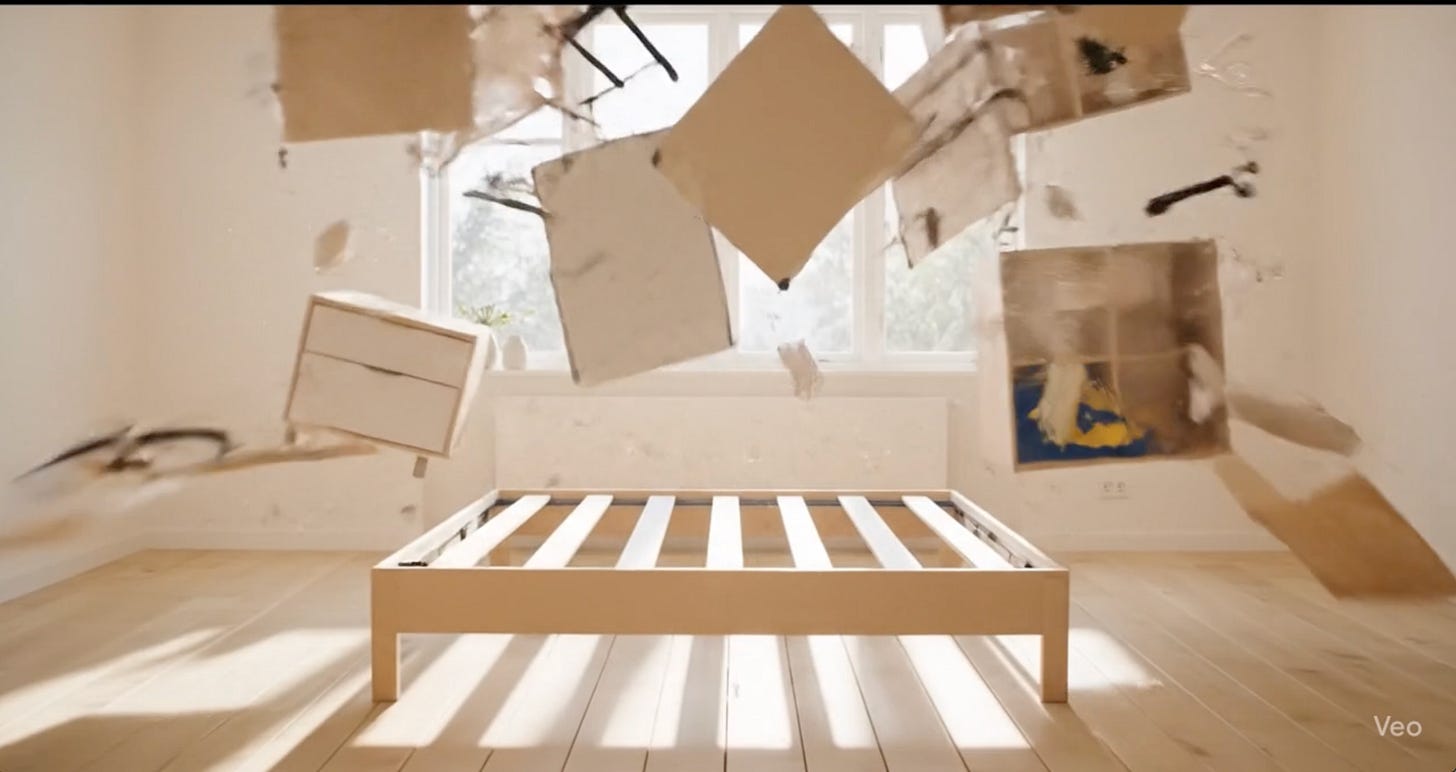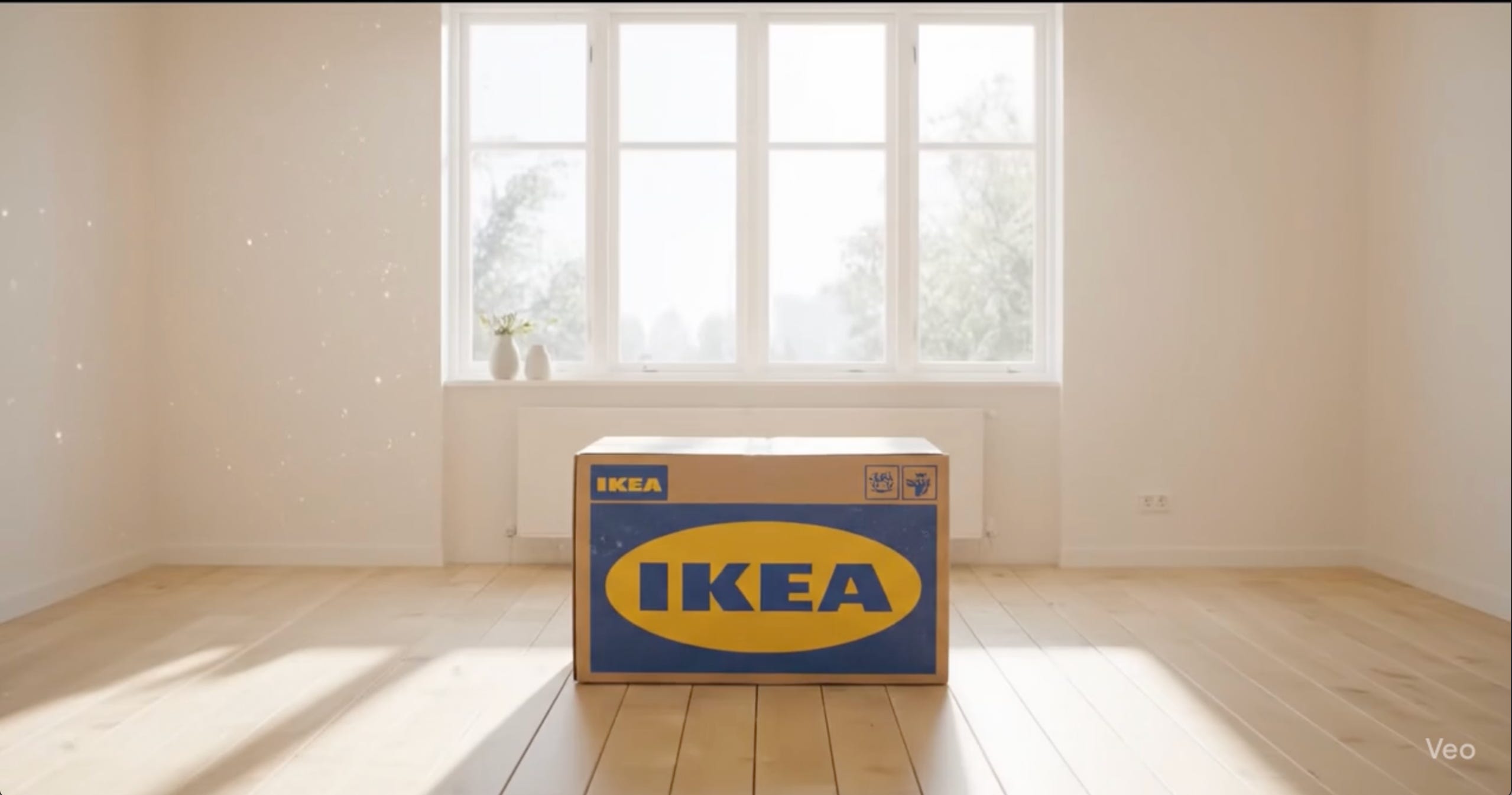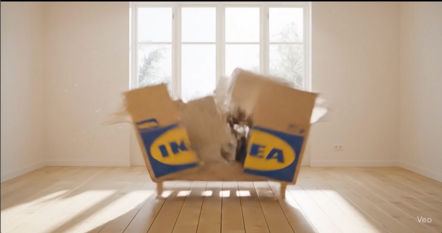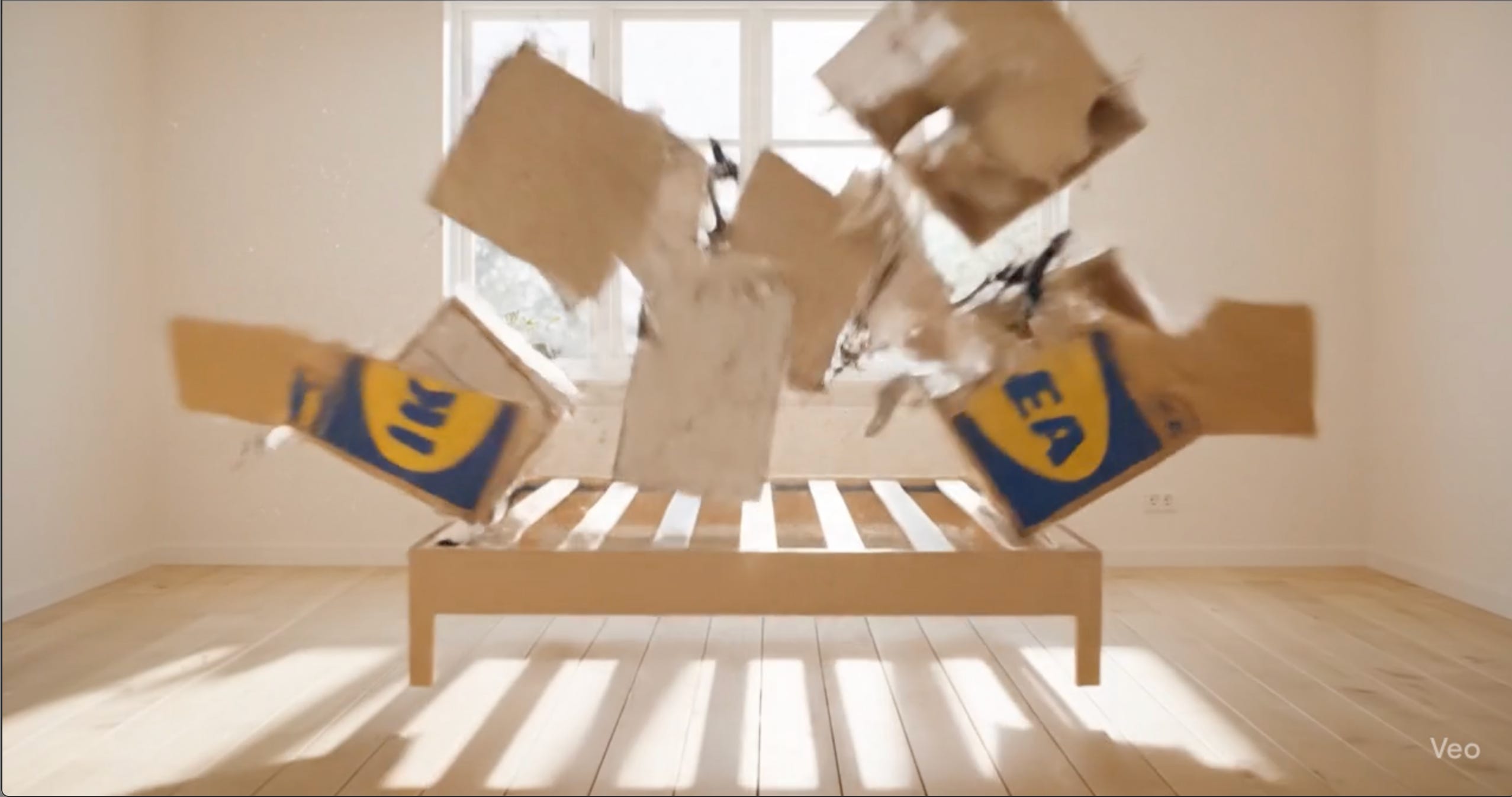 IKEA Box: A Flat-Pack Cinematic — Built in Google Veo 3 reimagines the iconic IKEA assembly process as an elegant cinematic experience. In this short AI-generated film, a single sealed box unfolds into a complete Scandinavian bedroom — bathed in warm lighting, adorned with plants, shelves, and the unmistakable yellow IKEA throw. No human hands, no voiceover instructions — just a silent, surreal ballet of flat-pack parts assembling with perfect precision.